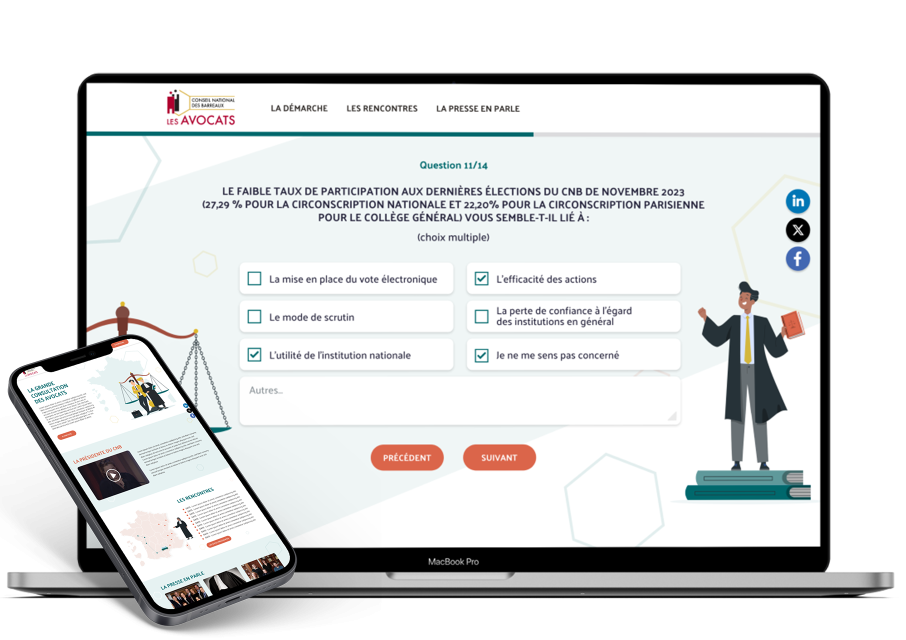 Création de la plateforme et accompagnement de la communication de La Grande Consultation des avocats destinée à recueillir les avis des 76 000 avocats français sur le fonctionnement des institutions et l'avenir de leur exercice professionnel.