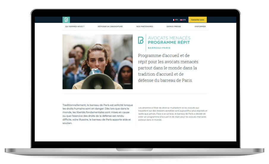 Conception et développement FR et EN de la plateforme Répit, pour l’accompagnement des avocats en danger dans leur pays d’origine.
